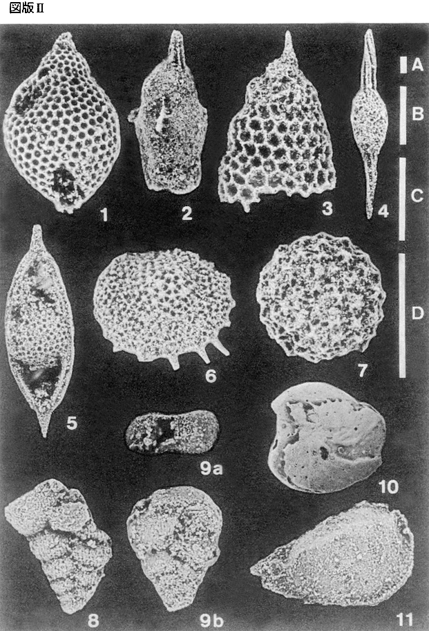 FOREMAN 図版II Loc.1より産出した放散虫:1〜7、有孔虫:8・9、貝形虫:11。 Loc.2より産出した有孔虫:10。