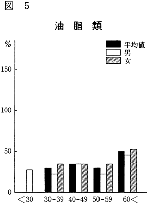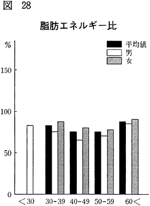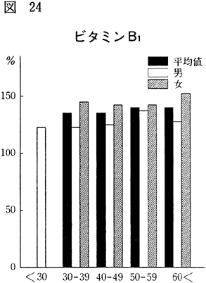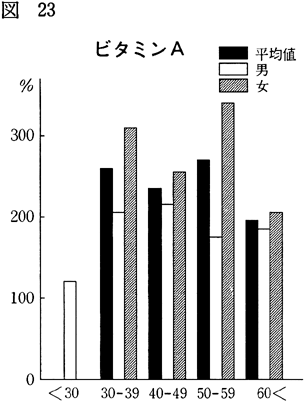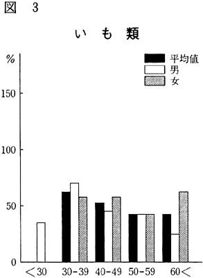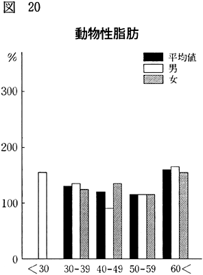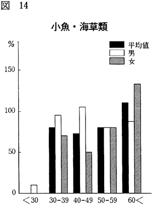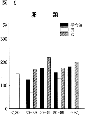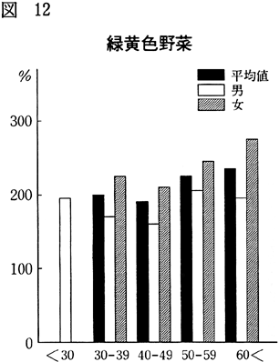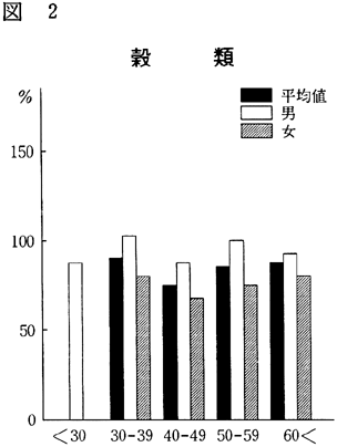 <結果および考察> 1)板野町住民の食品群別摂取量 板野町住民の食品群別摂取量は、「食品群別摂取量の目安」(速水氏案)を100%として比較した。(図1)穀物類は目安量をやや下回る程度の摂取量だった。芋類、油脂類が低値を示しているが、夏場の調査であるためと思われる。蛋白質源である、豆類、魚類、肉類、卵類及び乳類は、目安量を大きく上回っており、国民栄養調査の平均値と比べてもほぼ同等の値で、比較的よく充足されていた。緑黄色野菜、果実類も目安量を大きく上回っていたが、夏場はトマトや桃やすいかなどを多く食べるためと思われる。比較的充足されにくい小魚・海草類もよく摂取されていた。 2)年齢別にみた食品群別摂取 「食品群別摂取量の目安」(速水氏案)を100%として各食品群の摂取量を20才代、30才代、40才代、50才代、60才代に分けて検討した。穀類(図2)は、各年齢で男性が高く女性が低い摂取傾向だった。芋類(図3)は、年齢が高くなるにつれ低くなる傾向で、特に男性がそうだった。砂糖類(図4)は、40代以上の女性については摂取量が男性の2倍に達していた。油脂類(図5)は、各年齢で摂取の差はあまりみられなかった。 蛋白質源である、豆類、魚類、肉類、卵類(図6、7、8、9)及びミネラル源である乳類(図10)では、豆類、魚類、卵類は各年齢で比較的よく充足されていたが、肉類、乳類は、平均すれば目安量をみたしていたが、特に40才代以降は個人別にみると摂取量にばらつきが多く、みたされていない場合もみうけられた。 淡色野菜、緑黄色野菜、果実類(図11、12、13)は、どの年齢層でもよく摂取されていた。これらの野菜、果実類は、男性より女性のほうがより多く摂取している傾向がみられた。果実類は特に高い摂取だったが、これはすいかなどを大量に摂取したためである。 3)栄養摂取量 日本人の栄養所要量(第3次改訂)を100%としたときの板野町住民の平均栄養摂取量の比率(%)を図15に示した。板野町の結果は、脂肪を除く各栄養素とも所要量がよくみたされていた。充足するのが比較的困難なカルシウムや鉄もみたされているのはよい傾向と思われた。カルシウムがよくとられているのは、乳類がわりとよく摂取されているためであろう。鉄が充足されているのとビタミンAが所要量を大きく上回っているのは、今回の調査日がたまたま丑の日に当たっており多くの家庭で鰻を食べていたためと考えられる。ビタミンCとビタミンAの摂取が突出しているのも夏なので、すいかやオレンジジュースを多くとっているためであろう。 4)年齢別にみた栄養摂取量 各栄養素とも年齢の違いによる栄養素摂取状況の違いはあまり見られなかった。そしてどの栄養素もよく充足されていた。男女差では、ビタミンA、B1、B2(図23、24、25)が男性より女性の方が摂取量が高くなっていた。 5)みそ汁の塩分濃度 図30は、みそ汁の塩分濃度を測定し、その濃度の度数分布を示したものである。塩分濃度は、1.2〜1.4%をピークに70%以上の人が推奨濃度である1.0%を越えており、全般的に塩辛いみそ汁をとる人が多かった。しかしながら、アンケート調査の結果ではほとんどの人が自分の家のみそ汁を塩辛いと思っておらず栄養指導の必要性が考えられる。また、実際の食塩摂取量は平均約13gで全国平均とはほぼ同じであるが、厚生省の推奨値である10gよりは多く、指導による改善が望まれる。 6)アンケート調査結果 食物摂取調査は1日の結果であるので、食生活の全貌をとらえるべく、栄養意識及び食物摂取頻度について調べた(図31)。食品の組合せを考えている人は、女性に多くやはり女性の方が栄養意識は高いようだった。緑黄色野菜をよく食べると答えた人が多かったが、これは実際の調査結果と一致していた。食事を腹いっぱい食べると答えた人が多かったが、実際の調査では大きな問題となるような過剰摂取をしている人はあまりいなかった。欠食などをする人も少なく、全般に良好な結果であった。