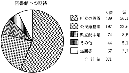 5.まとめ 板野町は、徳島市まで車で30分程の距離にあり、一部にベッドタウン化もみられるが、人口は昭和58年には13,724人、昭和63年には13,843人とほぼ横バイの状態である。 町には中央、南、西の3つの公民館があるが、そのうち図書館的機能を果たしているのは中央公民館のみで、他の2公民館は、殆ど全くと言っていいほど活動していない現状である。中央公民館図書室は、町庁舎に隣接しており、利用者はその周辺、町の中心部近辺の人が大部分である。調査の折、西・南地区では、「中央公民館までは車でないと行けないので利用しにくい。もっと近くにあれば…」という声が多く聞かれた。中央公民館から、他の2公民館へ巡回配本をするなどの方法をとれば、施設を有効に利用できるのではないかと感じた。西公民館は昭和63年度に改築され、図書室も整備されるらしいが、面接調査の際に教育長も述べておられるように各公民館が図書館の機能を持つことが望まれる。 また、座談会の席で、中央公民館図書室の利用者から、「公民館には子どもの本が少なく、時々県立図書館まで出かけているが、駐車場から遠いこともあり大変だ」との意見が出された。これに対して、公民館への配本に児童図書を増やしたり、読みたい本があれば希望図書制度で対応できることを説明した。それ以後板野町への協力貸出や児童図書の利用が増大したことは、今さらながらPRの重要性と現在のPRの不充分さを認識させられた。 アンケート結果から見た板野町の読書や図書館に関する意識は、前回の海部町、前々回の石井町の結果と殆ど差はみられなかった。町立図書館の設置を望む人は、56.1%あり、行政側も図書館建設に対してかなりの理解と意欲を持っているとみられることから、1日でも早い実現を望むものである。 |