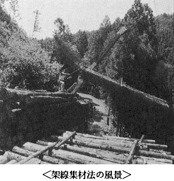 続いて、那賀川電源開発の本格的工事にともない木頭林業地帯の木材の全面的な陸送転換(水運から陸運)という事態に伴ない那賀川及びその支流における、県営の奥地林道事業が計画されるとともに、森林開発公団が設置され第一期事業の指定地域として剣山周辺地区(木頭・上那賀・木沢)がとりあげられ、総事業費8億円・開発延長林道11線82kmに及んでいる。この奥地林道の完成により木材の伐出・搬出の技術にも大きな変化をもたらした。流筏・管流の水運から陸送(トラック)に転換するとともに、木材の集材も木馬・水堰・鉄砲堰から架線集材法に改められ、架線=トラックによる輸送体系に整えられたのである。