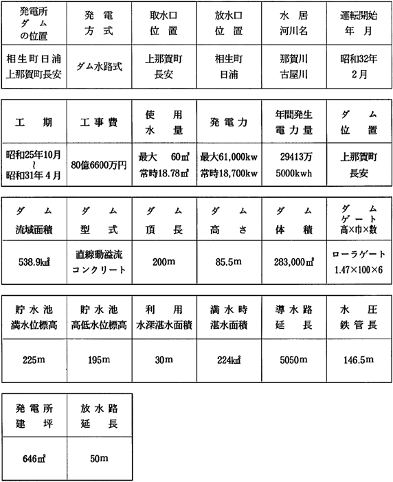 明治以降100年、那賀川と共に生きてきた町や村にもこうした課題をかかえ、かつ対応しながら村の繁栄と住民の幸せを願って来た。次に述べる事業も例外ではない。昭和25年に始められた国土総合開発計画の一環として、那賀川流域総合関発計画が打ちだされ大々的に電源開発が行われ、村業を基幹とする上那賀町の産業経済に大きな変化をみせるとともに、大きな村の課題となった。