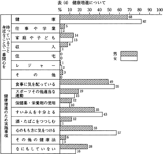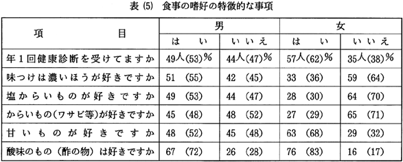 表(4)、表(5)は健康増進、食事の嗜好についての調査である。健康増進についての調査で、身近なことで一番関心を持っているのは、男・女とも「健康」と答えたのが圧倒的に多い。健康増進のための実施事項では男子が「食事」「すいみん」「心のもち方」の順であり、女子が「心のもち方」「食事」「すいみん」となっており、関心の順位は違っているが、男女ともこの3項目に関心をもっている。