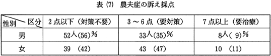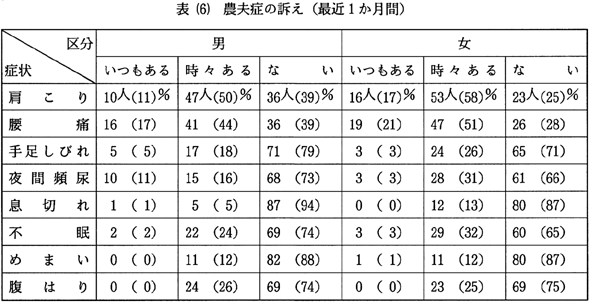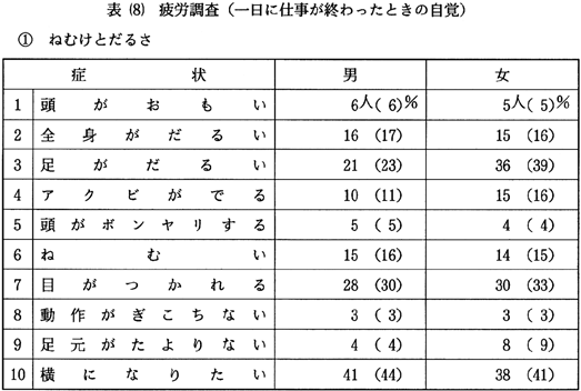 また、年1回の受診については、男子53%、女子62%を希望している。次に農夫症の調査については表(6)に示すように何らかの症状があると答えたのは、男女とも肩こり、腰痛が圧倒的に多い。表(7)の採点をみてみると、対策、治療を要する人が男子44%、女子58%と大変多くなっており、疲労の積み重ねが病気の始まりの危険信号と考えなければならない。表(8)は、1日の仕事が終わった時点での疲れの自覚症状について調査したものである。1 のねむけとだるさの10項目のうち男子では、「横になりたい」44%「目がつかれる」30%、「足がだるい」23%となっており、女子では「横になりたい」41%「足がだるい」39%「目がつかれる」33%の順となっている。