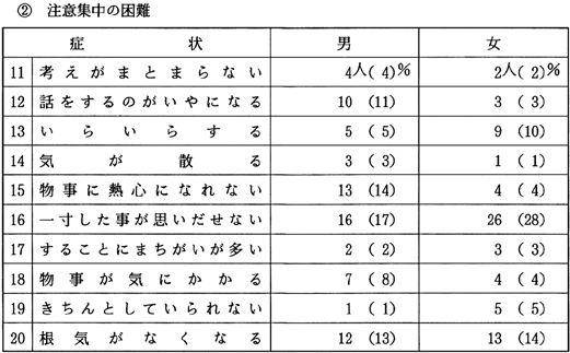 の注意集中の困難さを示す精神疲労では男女とも「一寸したことが思いだせない」「根気がなくなる」が多い。3