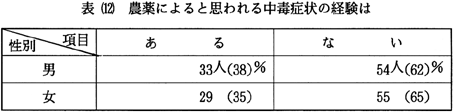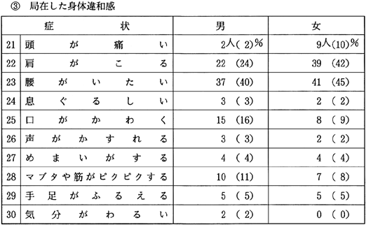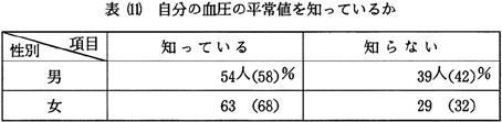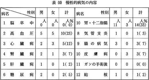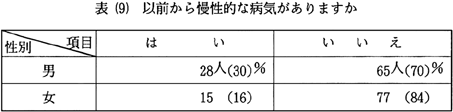 の局在した身体違和感では、男・女とも「腰痛」「肩こり」が多い。これは中腰、前かがみの作業が多いことに起因すると考えられる。表(9)表(10)については、慢性病についての調査であるが、男子では30%、女子で16%の人が何らかの慢性的な病気を持っている。その内容は「胃・十二指腸」「高血圧」が多い。表(11)は、自分の血圧の平常値を知っているかに対しては、男子が58%、女子が68%と女子の認識度が高い。