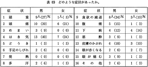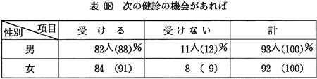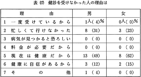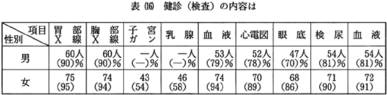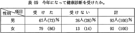 表(15)は健康診断の受診状況であるが、受診者は男子72%、女子86%と高いが、健康管理の第1条件である早期発見、早期治療のため、常に受診を呼びかけることが大切である。