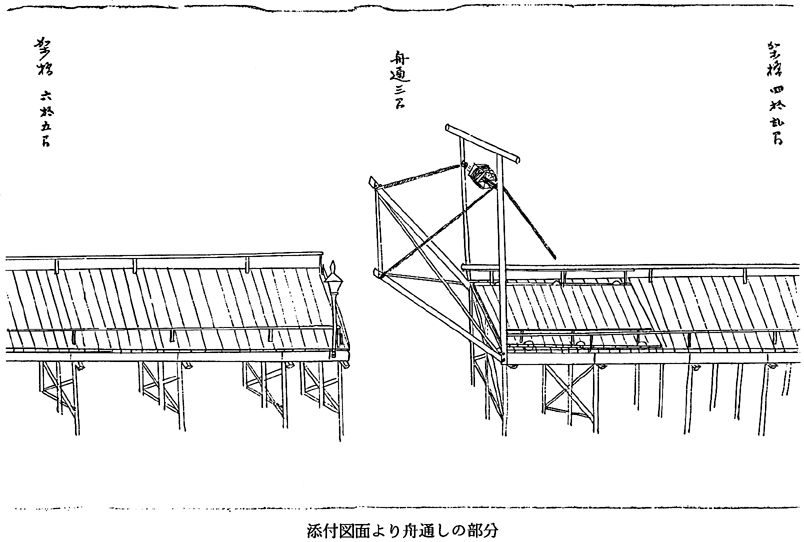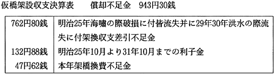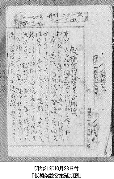 ) 従来の北岸附近を船橋とした構造を改め、船通しを設けた開閉橋にすべく県知事村上義雄宛、仮橋変更架設願いを提出。 明治29年 洪水の為流失。 明治30年 洪水の為流失。 明治31年10月28日(史料5