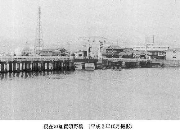 ) 広島浦総代、加賀須野村総代、起業人間で加賀須野船橋架設に伴う約定書を締結。 明治21年7月11日 広島浦総代、起業者間で約定證を締結。(総合学術調査発表会資料、H2年12月16日に紹介)、内容は史料(3)に類似。 明治21年11月12日 県より加賀須野仮橋の営業許可がおりる(期間10年間)。 明治25年 海嘯(津波)の為、全て流失。 明治27年9月 暴風雨・出水の為、過半流失する。直ちに古木を相交ぜ修繕。 明治28年1月30日(史料4