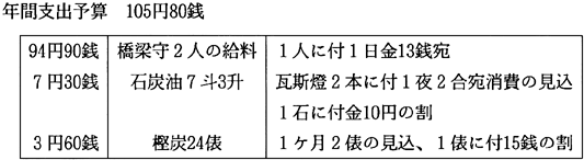 ―2 仮橋架設費調 1 橋杭 126本(42ケ所立) 但末口4寸長3間 松丸太69本 1本に付金60銭 此金 41,400 末口4寸長5間 松丸太57本 1本に付金1円50銭 此金 85,500 1 橋梁 42本 但末口5寸長1丈 松杉丸太取交 1本に付金38銭 此金 15,960 1 行桁 126本 但末口4寸長2間 松杉丸太取交69本 1本に付金33銭 此金 22,770 末口4寸長3間 松杉丸太取交57本 1本に付金75銭 此金 42,750 1 橋板 106間 但厚1寸5歩長9尺 松栂杉取交 1間に付金3円30銭 此金 349,800 1 欄干柱 126本 但松杉取交2寸丸太 1本に付金4銭 此金 5,040 1 手摺木 86本 但松杉丸太取交 長3間40本 1本に付金45銭 此金 18,000 長2間46本 1本に付金25銭 此金 11,500 1 船通シ捲揚柱 2本 但末口3寸5歩長4間半檜丸太 1本に付金3円 此金 6,000 1 巻揚柱笠木 1本 但末口4寸長1丈檜丸太 此金50銭 此金 0,500 1 船通し用行桁 3本 但長三間末口五寸杉丸太 1本に付金2円50銭 此金 7,500 1 船通し用引戸 1巻 但桁栂3寸4寸角長3間4本 1本に付1円30銭 此金 5,200 梁栂3寸4寸角長1丈2本 1本に付60銭 此金 1,200 1 船通し用桁縛り 2本 但並貫長2間 1本に付20銭 此金 0,400 1 橋杭シヅカイ貫 84本 但並貫又は背板長2間 1本に付20銭 此金 16,800 1 綱 60尋 但苧及椋欄綱 1尋に付8銭 此金 4,800 1 船通し用金具 但獨楽八ツ 1箇に付金20銭 此金 1,600 敷金長6間半2筋 1筋に付2円80銭 此金 5,600 1 釘 10貫目 但 1貫目に付金50銭 此金 5,000 1 橋板押へ木 103本 但杉並貫長2間 1本に付金20銭 此金 20,600 1 橋台石垣 2ケ所 但平八坪 1坪に付金2円 此金 16,000 1 洋燈 2箇 但 1ケに付金1円50銭 此金 3,000 1 大工 250人役 但 1人1日金50銭 此賃 125,000 1 橋守小家 1棟 但瓦葺梁行1間桁行1間4尺 此坪1坪6合 此代金 11,200 1 人夫 100人役 但 1人1日40銭 此賃 40,000 1 架橋中諸器械借上其他雑費 此金 30,000 合計金 893円12銭