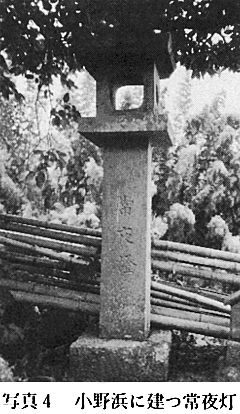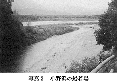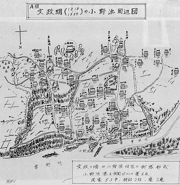 しかし、この河川を利用した■船・高瀬船は、江戸・明治大正の400年、人員や物資の輸送に大きな役割を果たしてきた。なかでも吉野川の■船は、県都徳島や県の玄関撫養港と、流域の村々を結ぶ約100kmの間に就航し、阿波の交通の大動脈としての役割を果たした。とりわけ藩政末期からの急速な産業経済の発達を支えた意義は、今日の鉄道・自動車輸送〈注2〉に匹敵するものであった。 〈注2〉「■船の輸送力」・この頃の陸上輸送の最大なものは、馬であった。馬1頭の輸送力は米2俵(1俵は4斗=16貫=60kg)が限度とされた。米50石を運ぶとすれば馬63頭と同数の人夫が必要。なお1日の行程は30km位・半田〜徳島間を60kmとみて2日かかる。この間の宿泊・人間・馬の食事に用する費用も大きい。なお夜は馬背から荷物をおろし、出発には再び馬の背にのせるが、この費用も手間も甚大なものとなる。すなわち当時の陸路の遠距離輸送は高額な運賃が必要とされた。これに反し、水運を利用する■船(50石積の■船)の場合は、米50石を1艘の■船と約2人の船頭で、2日かかれば、徳島・撫養に輸送することができた。■船が繁盛を極めた理由もここにある。 (2)小野浜の常夜灯と船玉神社 小野浜の船着場に今も、文政9年(1826)に建立された常夜灯が当時の繁盛を語りかけるように吉野川に向けて静かなたたずまいを見せている。 この常夜灯は、和泉砂岩で作られた高さ185cm・日月の掘り抜きの明り窓があるりっぱな造りである。小野浜を港とする50艘の■船の夜間の標識とするとともに、荷積み・荷降し(船から馬・荷車・馬荷車から船へ)の照明として、大正3年3月の鉄道開通(徳島〜池田)まで灯し続けた。常夜灯とともに、小野浜の船頭や船主・船関係者が航行の安全を祈願するため、四つ橋より小野浜に出る道の東側に、天保11年(1840)に船玉神社(祭神猿田彦命)を創建している。爾来、年2回(正月・秋)の祭日を定め、船業関係者によって祭祀が続けられた。しかし、■船が廃止になるとともに、船玉神社も八幡神社の社地に境内社として移され、現在に至っている。常夜灯・船玉神社ともに、当時の小野浜の繁盛を偲ぶよすがであるとともに、船乗りたちが船運に命をかけていた証しでもある。 (3)半田素麺を支えた小野浜 阿波の素麺と言えば、半田素麺と答えが帰って来るほど阿波を代表する特産品である。この半田素麺は、天保の初期に大和三輪(三輪素麺)より、淡路福良・撫養を経て半田に伝えられた。大和三輪の流れを汲む製麺法と言える。これは、半田小野浜の船頭が、家族の副業として導入したと伝えられている。 本格的に製麺が始まったのは、天保4年(1833)に小野浜の敷地屋国蔵(びんつけ屋)が、弟長兵衛とともに、従来の副業より本格的な製麺業をおこしてからである。当時の素麺相場が、「兵助日記」〈注3〉に「素麺7貫目につき55匁目・小売60匁」とある。 近代に入り需要の拡大にともない、明治年間には生産量が15,000貫・製麺戸数が50戸に達している。このように順調な発展をみたのは、小野浜地域が製麺に適した自然的条件に恵まれていたことによる。ひとつは、冬季の日乾・庭干しに吉野川を渡る季節風が適していた。次に、製麺に適した水(鉄分・カルシウムの少ない軟水)が段丘の井戸水にあった。なお、小野浜の港をもっていたため、■船によって低賃銀で容易に原料(小麦・撫養塩)の移入と製品の移出がされたことにもある。こうして小野浜を中心とした半田素麺の製造は、維持発展を遂げ、今日に至っている。 (4)御分一所と通行手形 藩政時代は、旅行者や物品の移出入に関しては、藩が設置した御番所や御分一所において厳しい取締り(移動の許可や物品の課税)が行われた。また、物品等の移出入については、通行(送)手形を必要とした。通行手形は、時代や物品の種類により異っていたが、嘉永以降(1848)は、村役人の手形で移動が行われるようになった。 次の覚書が、当時の村役人による通行手形の1例である。 覚 4匁8分7厘 大田市蔵 1.葉藍 47本半・竹皮3丸 右者当村作人共当子年出来葉藍同村・船頭市蔵船に積下申に付御分一所 御通被遊可被下候 以上 子7月 美馬郡太田村 徳太郎■ 御分一所様 (5)小野浜の馬宿 小野浜に集散される上げ荷(積み上げ)・下げ荷(積み下げ)の物品は、総て馬の背にたよった。当時の陸上輸送の最大の機関は馬であった。 この運送にあたった馬を荷付馬と呼び、三々五々隊をなして半田奥山や近隣の村々との間で上げ荷(日用品・雑貨品、塩等)・下げ荷(木炭・藍・楮・樵木等)を運んだ。明治の繁盛を極めた頃、馬専用の宿屋(馬宿)ができている。明治14年に佐々常が開業しているが、現在の敷地部落の佐々政子氏経営の佐々旅館の前身と考えられる。吉野川流域で、馬宿をもっていた浜(津)は珍しい。 〈注3〉「兵助日記」兵助日記は、半田村小野の敷地屋兵助が天保時代以降の半田3か村を中心とした世相・事件・行事・政治経済万般を記録した書である。当時の古文書や古老からの聞きとり、兵助自