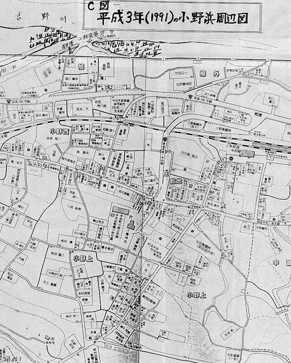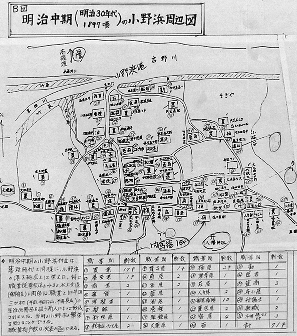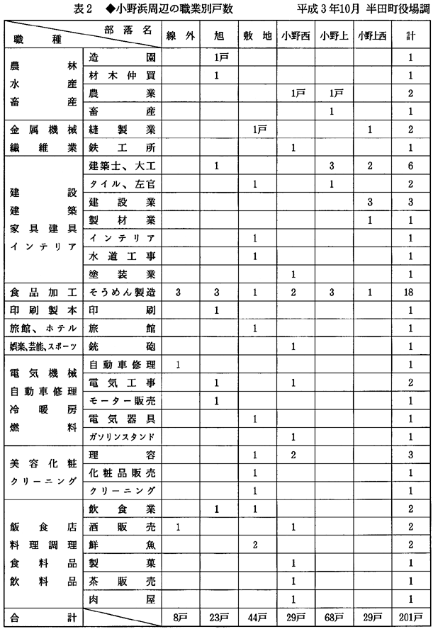 小野浜周辺の戸数をみると、藩政期53戸が明治30年代には70余戸となり、現在200余戸に増加している。これらは、国道192号線沿い、県道半田貞光線沿い、半田駅周辺の小野西・旭・敷地地区に集中している。また職業も時代の要請にこたえ、図3、図4中の表に掲げた職業別戸数の如く変化を見せている。 ■船就航の全盛時代であった幕末から明治(全盛期には50艘余の■船が出入り)にかけての小野浜周辺には、船頭や乗客・荷物(上荷・下荷)を対象とした店屋が軒を並べていた。現在の半田貞光線(県道)と小野浜より小野峠に通ずる浜往還道の交差点、四つ橋を中心として菓子屋、傘屋、鉄砲屋、宿屋、酒屋、飲食、料理屋、魚屋、雑貨屋、びんつけ屋、桶屋といった商港にふさわしい商店街を構成していた。当時の店屋は屋号で商品の取引きを行っていた。今も当時の屋号〈注6〉が使われている。 明治の繁栄は現代に引継がれ、小野浜周辺には200余戸の一大集落地が形成された。大正3年の国鉄半田駅の設置、県道半田貞光線の整備拡充、半田奥山に通ずる県道八千代線の改修、加えて国道192号線の新設が戸数増加の大きな推進力になったことは言うまでもない。 職業も、■船の廃止とともに明治中期の職業とは大きく変った。なかでも、農業専業・藍商・運送業に関係する船主、船頭、馬宿等の職業が姿を消し、表2 小野浜周辺の職業別戸数に示すように多種多様な職業構成になって、町が働いている。今後の小野浜がどう変わって行くか、今後の町の政治のとりくみと産業経済の動向に大きくかかわる問題であろう。 〈注6〉「小野浜の屋号」今づ屋・びんつけ屋・にしら屋・敷地屋・大道・坂八・かぎ屋・杉屋・鉄砲屋・川の屋・桶屋・こてや・はなや・穴口・写真屋・米屋・はこやの屋号が残っている。この調査の収集に、「びんつけ屋」小浜広吉氏(大正2年5月5日生)を訪ねたが、小浜氏によれば「私の代まで、びんつけ屋を職として5代続いた。小野浜の船着場に近かった関係で来客も多く商売も繁盛していた。当時の商家で使った屋号は今もその家を代表する家名として使われている。」とのことであった。