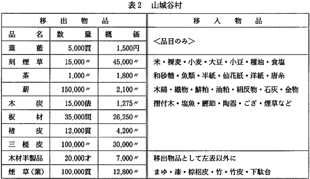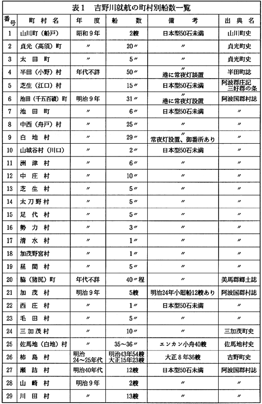 航路…川口池田−辻−小野−脇−穴吹−岩津−第十−大寺−三つ合−今切川−榎瀬川−吉野川−新町川(徳島) 撫養航路… 川口池田−辻−小野−脇−穴吹−岩津−第十−大寺−旧吉野川−三つ合−新池川−撫養 〈下り航路は上り航路の逆で運航する。〉 〈注4〉「50石積■船」■船の積荷の標準は、50石。1石を20貫として大体1000貫・約4トンを積荷とした。 (3)浜と船数 吉野川就航の■船の正確な船数を知る資料はない。明治9年1月の阿波国郡村誌が残っていれば正確な数を把握出来るが、一部が欠落していて、不可能である。船数不詳の村・年代・船種別など不統一な点もあるが、現存する、阿波国郡村誌・郡史(誌)・町村史(誌)・から収集録し、表1にまとめてみた。正確ではないが、概数をとらえることができる。なお、川船の所有者や船頭等船業関係者は、美馬郡・三好郡に多かったことが資料よりわかる。 当時の船運の状況が、『阿波郡庄記』三好郡の条に次のように記録されている。「芝生村南北加茂村の内に、江口と云う渡場あり・讃州金比羅へ参詣の節帰りには当村へ出かけ船数艘下りあり。3月・10月・10艘または15艘、人ばかり乗船夥敷く宿多く御座候」とある。徳島新聞夕刊(昭和45年3月21日)に徳島史学会の「ふるさと散歩52」の報告で「池田と大寺(板野町)との間には750隻の船が動いていた。その分布状況は、市場47〜8・脇町猪尻40・池田30・成戸12〜3・中島渡24〜5・辻20・岩戸24〜5・喜来4〜5・岩倉2〜3・大田4〜5」とある。出典並びに年代が不詳であるが、当時の船運の繁盛ぶりを知ることができる。 浜(津)吉野川には、多くの浜(津)があった。■船の寄港のできる浜として、30に近い浜名が残っている。(図1)・そのほかにも、芝原の浜・中の島の浜・江ノ脇の瀞・轟の浜・足代の東浜などの名もみえている。 (4)■船と輸送品 ■船による輸送物品(上荷・下荷)について、■船の全盛時代であった明治30年代の移出入物品の記録を『山城谷村史』・並びに『貞光村史』から取りあげてみた(表2、3)。これによって当時の物品の動き、数量の大様を知ることができる。