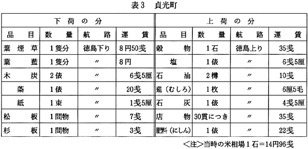 「阿波郷土会報」11号の「吉野川の輸送船」に、二条の浜(板野郡土成町)〜徳島間の■船の運賃が次のよう記録されている。「下荷(二条の浜より)」:藍玉20入・1俵・5銭、スクモ13〜4貫入1俵2銭5厘〜3銭。「上荷(徳島より)」:肥料用大豆粕7貫300匆入1俵・2〜2銭5厘、ニシン粕・鰮のホシカ20〜25貫入1俵・10〜12銭。「撫養からの上荷」:塩1俵・7貫入2銭〜3銭。 上表でもわかるように、当時の吉野川流域の主な移出物品は、煙草・木材・樵木・薪・木炭・三椏・楮・葉藍・藍玉・すくも。移入物品は、米・裸麦・小麦・大豆・小豆・食塩・種油・柿原の和砂糖・魚類・半紙・洋紙・唐糸・木綿・織物・鯡粕・鰹節・陶器・畳表ござ・肥料・石灰であった。 (5)繁盛をきわめた■船 1 『阿波郡庄記』より…「芝生村南北加茂村の内に、江口と云う渡場あり。讃州金比羅へ参詣の節、帰りには当村へ出かけ船数艘下りあり。3月10日、10艘または15艘、人ばかり乗船夥敷く宿多く御座候」とある。半田小野浜にも船頭多く乗船客も多く、明治末期〜大正初期の半田小野浜〜船戸(川田から鉄道)間の船賃は3銭5厘とある。 2 徳島日々新聞…明治28年2月23日の報道に「吉野川筋貨物を積載上下する船数150隻・1か年の往復回数2万回・物資品目・藍玉・藍草・すくも・玉砂・砂糖・塩・石灰・鯡粕・米麦・煙草大豆・木炭・薪・雑貨・陶器・物資総重量200万貫・船客用の船50隻・利用船客6〜7万人・内・県外客10分の1、時期は9月から翌年5月の間が多い。(風と水量と農繁の関係) 3 帆かけ舟「春夏は川に沿って東風が吹くので帆かけ船が上って来る。夏・水泳に行くと大きな帆(8反帆)をかけた平駄船が後から後から船首に波をけって上って来るのを面白く眺めた。また、秋冬は・西風となるので帆は利用できず2〜3人の船頭が綱で船を曳いて上る。脇町の対岸の河原の水辺を綱を肩にかけ身体を前に屈めて船を曳く景物をよく見た。帆かけ船は全国何処の川にもあっただろう。しかし吉野川の如く巨大な帆を使用した処は他にあまりなかっただろうと思う。吉野川の帆かけ船は日本一であったかも知れぬ。とにかく吉野川の風景に興趣をそえるものであった。……」(笠井藍水の回想記) 4 『山川町史』に「吉野川は常に帆かけ船の航行で賑わっていた。寛政10年(1789)の頃、タデ藍の製造に使う玉砂だけでも輸送量は1500石・トラック950台分ぐらいあった。これは、わずか1部で、肥料・藍玉・米麦・雑貨・薪・炭・塩等も含めると吉野川流域で動く物資のほとんどが川船に積み込まれていた。…後略…」 (6)船頭の収入 明治の頃の船頭の様子や収入について、「吉野川の輸送船」(「阿波郷土会報」11号)に次のように書かれている。「50貫の石を抱えて歩く。35貫のニシン肥1俵をくるりと担ぐ。穀物5斗俵1つなら片手で肩に乗せるのが普通であるが、そのうえ川幅の狭い急流や渦さきを熟知して他の船や障害物に衝突しないように進んで行く「ケンワリ」を心得えている荒シコの給料が半期(6か月)で25〜30円・「ケンワリ」を知らない5斗俵ひとつを片手で担ぐだけの能無しは、14〜15円(食事船主持)船は男世帯、船主のほか船頭2人乗る。」 大正初期の小野浜(半田)〜徳島間(標準が1往復10日間)の労働収入は、3〜3円50銭程度であった。ただし、船頭が船主でもあり仲買商を兼ねての物資の上荷・下荷の運送取引を行う場合は別である。■船1艘の船主は、少なくとも水田1町歩の農家に相当する収入があったと言う。(「阿波河川の歴史的変遷過程の研究」小原亨著) 4.■船の終えん 吉野川の船運は、明治の中期(明治30年代)が最盛期であった。明治の後半に入り、漸次陸上交通路の整備改修が進められるとともに、牛馬車・大八車・トラックヘと輸送能力の高い車種が導入されるにともない、河川交通から陸路の時代へと移っていった。 なかでも、■船に大打撃を与えたのが、明治33年に徳島鉄道が徳島〜船戸(川田)間に鉄道を敷設し、更に大正3年3月には池田まで延長されたことである。致命的な打撃を受けた■船は、大正5年には吉野川からその姿を消してしまった。ただし、半田3カ村にあっては、鉄道開通後も、3カ村で生産された樵木材(松材)〈注5〉を大谷焼の窯元(板野郡大谷村)まで■船によって直送をした。鉄道輸送では、徳島駅から荷車または船に積みかえる繁雑さと運賃のコスト高があったため、■船運送が有利であった。こうしたことで、大正10年頃まで小野浜より■船が就航した。 〈注5〉「樵木(こりき)」半田3カ村から伐り出す樵木は、松(赤松)で、小野浜より板野郡大谷村へ積出した。半田奥山産の樵木は、半田川を管流(バラ流し)によって搬出した。樵木は、長さ2尺(60cm)量は1升を単位とする。1升は樵木を高さ3尺(90cm)長さ12尺(360cm)に積んだ量をいう。■船に積込む樵木は、1斗〜1斗2升程度であった。 5.兵助日記にみる小野浜 兵助日記のなかに、小野浜に関する記録が残っている。当時の小野浜の人や物資の動きが知れる。その1部を原文のまま報告する。 1 「安永8巳亥歳正
