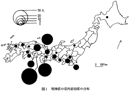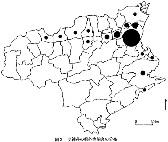 明神荘利用の目的や各利用者の社会的関係に関しては、すべての利用者について把握できないものの、以下のような傾向が認められる。1976年度にはかなりあった「研修」などを目的とする利用者は近年はほとんどなく、10人以上の団体利用客は1976年度の15.6%から1992年には6.6%にまで減っている。それゆえ、宿泊客1組当たりの利用者の平均人数は、1976年度の6.2人から1992年には4.7人に減少し、家族もしくは友人を単位とする利用層が大半を占めている。 なお、利用者はゴールデンウィークと夏休みとに集中するが、相対的にはゴールデンウィークにおける利用の比重が高まりつつある。すなわち、1976年度には全体の3%がゴールデンウィークに、66%が夏休みに利用していたのに対し、1988年にはそれぞれ16%・63%、1992年度には15%・49%と推移した。 (3)田井の浜海水浴場 1