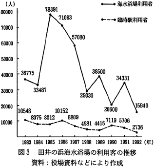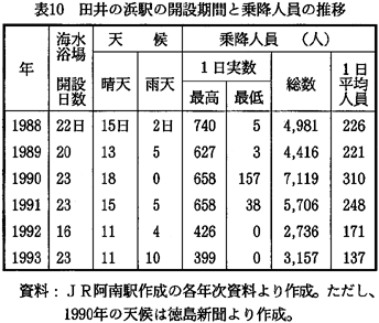 4年ぶりの冷夏となった翌年の1991年はやや減少している。また、1992年はサメ騒動のために全国的に海水浴場の利用客が激減した。田井ノ浜海水浴場も例外ではなく、臨時駅の開設期間も短くしたため、総数は最低を記録している(図3・表10)。さらに、1993年は冷夏と相次ぐ台風の来襲で天候に恵まれず、「雨天」の日が「晴天」とほぼ同数であった。そのため、1日平均でみると前年実績をさらに下回り、最低記録を更新した。