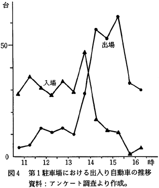 田井の浜海水浴場利用客の時間的動向 当海水浴場の臨時駅周辺には3ケ所の駐車場があり、海水浴客の時間単位での駐車場(=海水浴場と海水浴客の結節点)の利用行動を把握するために、駐車場における車の出入り調査を行った。以下、230台の最大収容能力を有する第1駐車場の調査結果について報告する。本調査も、海水浴客アンケートと同じ8月1日に行った。この結果、10時〜16時40分の間に318台の車の出入りが確認された。ただし、調査を開始した10時の時点ですでに36台が駐車しており、また調査終了時の16時40分にはまだ8台が残っていた。この他にも、入場もしくは出場のいずれかを確認できなかったものが52台あり、調査対象とされるのは残りの222台である。 出入りの時間帯の中で注目されるのは14時以降の急激な出場であるが(図4)、これはこの頃から激しくなった驟雨(しゅうう)のためである。10時30分から13時30分までは、おおむね30分間に30〜40台の入場があり、11時以降には出場する車も増え始める。13時30分から14時にかけては入場車がきわめて多いが、これは、昼食のために再入場した車と、午後になって新たに来場した車のピークとが合致したためで、この頃には駐車場は満車状態となり、駅裏や海水浴場西側(木岐側)では周辺道路への違法駐車も多くみられた。 入出場時刻が明らかな222台について、途中の入出場を考慮せず、最初の入場時刻と最終的な出場時刻から駐時間を算出すると、当日は3時間前後の駐車が最も多くみられた。ただし、この点については、当日の天候変化も考慮に入れておく必要がある。