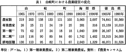 生産基盤と生産性 背後を海部山地が占める由岐町は、山林面積の占める割合が多く、耕地率は4.1%しかくなく、その多くが田井・木岐地区の平坦地に限られている。耕地の水田率は73.4%に達しているものの、農業経営の安定基盤とはなっていない。1965年から90(平成2)年にかけて、農家数は53%、経営耕地総面積は48%も減少した(表1)。一船的に、農業経営体と農業経営基盤の相対的数量は、工業生産の拡張によって地元労働市場の拡大をともなった地域経済構造の社会的変化に対応し、専業農家と兼業農家の地域内分化を経て、脱農化に向かう傾向にある。由岐町でも、農家数の減少は第一種兼業農家(1965〜90年の25年間に82.5%の減少)および第二種兼業農家(同49.2%の減少)に顕著であって、専業農家の減少(同3.8%)は極めて少ない(表1)。このことは、農業経営基盤が小さく、農業収入が農家収益につながらず、早くから脱農化が進行したことを示すものである。