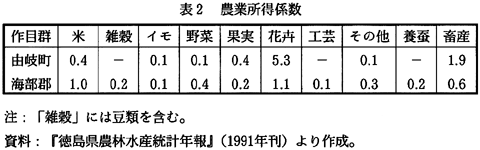 由岐町の農業粗生産額は、1965年の2.02億円から1990年には6.93億円と2.9倍になっている。1990年における農家1戸当たりの農業生産所得は107.4万円で、徳島県平均の114.0%、海部郡平均の165.5%にあたり、県内の市町村ではかなり高い所得額を示す。土地生産性(耕地10a当たり生産農業所得)も15.9万円で、同じく徳島県平均の117.0%、海部郡平均の182.8%にあたる。これに対して、労働生産性(農業専従者1人当たり生産農業所得)は78.8万円で徳島県平均の77.0%、海部郡平均の98.7%にしか充当しない。 以上のことから、由岐町では耕地面積と兼業農家数を減少させたものの、その一方で少数の専業農家による土地利用の高度化を展開させ、土地生産性と1戸当たり農業生産所得を高めたと考えられる。こうした地域的特性は、専業農家による特定農業部門に集中した季節性のある商品生産農業を行った結果でもある。 1990年の作目別の農業所得の状況を所得係数からみると(表2)、花卉・畜産が高い値を示す。この所得係数は、徳島県の個別作目の平均農業所得を1とし、係数1を越える作目群は集中栽培が行われていることを意味する。由岐町の場合、とくに花卉栽培への集中度が顕著である。このことは、花卉栽培が地域的に集中する特産地が形成されていることを示すものである。