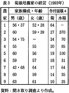 と小規模であったが、1983年に田井地区の団体営圃場整備が完了したことにともない、加温式ハウスの建造が進み、現在は9戸の農家(施設面積2.13ha)が菊を栽培している(表3)。1戸当たりの平均栽培面積は23.7a