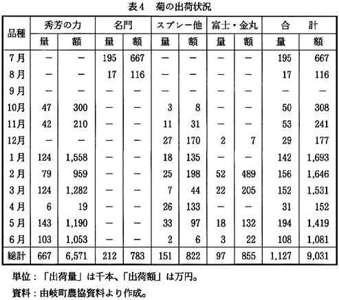 菊の品種の主力は「秀芳の力」で、その他に名門や富士、スプレー、金丸などが栽培されている。これら数種の組み合わせにより、周年栽培が可能となった。1992年7月から翌年6月までの共同出荷実績を通じて栽培の実態をみると(表4)、総出荷数1,127千本のうち、「秀芳の力」59.2%、名門18.8%、スプレー13.4%などとなっている。品種別の出荷状況をみると、「秀芳の力」は10月・11月および翌年1月〜6月までの8カ月間、名門は7・8月の夏場、スプレーは10月〜6月に出荷されている。出荷総額は約9千万円で、主力品種の「秀芳の力」が72.8%を占めている。なお、「秀芳の力」を中心として9月は菊の育苗期にあたり、また、栽培農家の大半が稲作との複合経営を行っている関係から(表3)、田植の行われる4月には出荷量は減少する。 出荷は個別選花で共同出荷をとる場合、市場取扱日である月・水・金の前日に出荷する。出荷先は大阪府下の生花業者で、ダンボールケースに200本を箱詰めした13〜15kg