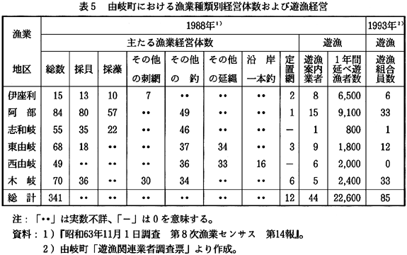 (2)漁業構造 由岐町の沿岸はいわゆる磯漁地帯をなす。古来、海部郷は潜水漁業を主とする宗像系海人族が、筑前地方から瀬戸内海を経由して定着したといわれ、10世紀に編纂された『延喜式(えんぎしき)』には、アワビが貢納水産物としてあげられている。また、藩政期には阿部(あぶ)、志和岐(しわき)、由岐、木岐(きき)に魚分一所が設置され、イワシ船曳網や任せ網、カツオ釣、海士(あま)漁業が盛んであったといわれる。 しかしながら、明治中期以降、網元経営による大規模な網漁業は衰退し、それにかわって東シナ海の以西底曳き漁業や遠洋マグロ延縄漁業に出稼ぎに行くものが多く、資本や人口の流出がみられた。また、沿岸では網漁業の衰退により、相対的に海士漁業の比重が高まったものの、阿部地区では一部の離脱漁民が「いただき行商」を行うこともあった。遠洋・沖合い漁業が後退した現在、由岐町の漁業は沿岸漁業を中心に展開されている。 由岐町には伊座利、阿部、志和岐、東由岐、西由岐、木岐の漁業集落があり、集落ごとに漁協が存在する。漁協が分立しているのは、古来より海士漁業が盛んで各集落の地先権が確立していたことにもよるが、各々の地区の漁業形態が異なることも大きい。 表5は、1988年における漁協別の漁業形態をみたものである。伊座利地区は、会社資本で行われていたブリ大敷網定置を、1955年より組合自営としたが、ブリ漁の不振もあって、近年は採貝業のウェイトが高まっている。