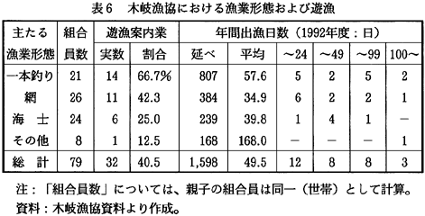 阿部地区では、東隣する伊座利地区の大敷網に刺激されて1952年に阿部大敷網組合を設立したが採算が合わず、1957年には早くも廃止に追い込まれた。他方、残された採貝業も、磯灼(いそや)けによる海草類の繁殖不良や乱獲によって不振を極めた。しなしながら、1960年代になって、アワビの餌となる荒布の採集禁止や稚貝の厳重な保護対策などによって、1963年以降、アワビの生産量が回復し、市場へも最高級銘柄である「阿波クロアワビ」としての安定供給が可能となった。他方、1969年に阿部漁港の改修工事が完了したことにより、小型漁船を利用してのイサキ・アジ・タチウオ・カツオなどの一本釣り漁業が操業可能となり、採貝業との兼業によって周年操業も可能となった。 荒磯のために港湾施設がなく、元来、磯漁中心であった志和岐地区では、1955年より組合自営のマグロ延縄漁船を操業したが、不振のために1962年にはこれを売却し、その売却金をもとに漁協経営の養豚業を行っている。志和岐でも、1950年以降、漁港の建設・整備によって小型動力船が普及し、近年は釣り漁業にも進出している。 伊座利・阿部・志和岐地区では漁港に恵まれず、漁船漁業が本格的に普及するのは1960年代以降であった。これに対して、由岐・木岐地区は良港を有し、早くから釣り・延縄・刺網などの漁船漁業が展開された。東由岐は延縄・一本釣りが中心で、そのほかに採貝業・定置網などの多様な沿岸漁業が営まれている。 他方、西由岐地区は沿岸に独自の地先漁場をもたないため、沖合いの共同(入会)漁場への出漁を行ってきた。戦前には、東シナ海の以西底引き網漁業に多数の出稼ぎ者を出した漁村でもある。現在は、沿岸での一本釣りや釣り・延縄漁業が多い。木岐地区は地先漁場の範囲が広く、町内にあっては定置網の比重が比較的高くなっている。この他には、一本釣り+エビ刺網や釣り、海士漁業が中心となっている。 (3)遊 漁 上述した従来の漁業形態に加え、1980年代後半以降、各漁協とも遊漁案内業を兼ねる漁協組合員が増加している(表5)。これは、由岐町沿岸が「ハエ(碆)」と呼ばれる岩礁や複雑な海岸線の出入りのある天然の釣り場を提供しているという優れた自然条件に加え、80年代後半からの「釣りブーム」による社会的ニーズの高まり、さらには各漁協とも港湾整備によって小型動力船が普及していたことによるものである。また、漁協組合員にとっても、遊漁案内業が安定した現金収入源をもたらしている。 例えば、木岐漁協では1988年には遊漁者は5人を数えるに過ぎなかったが、1992年には32名(営業実数)にまで増加し、組合員の4割強を占めるに至っている(表6)。前述のように、木岐地区はおもに定置網・一本釣り・海士漁の3漁業形態からなるが、いずれの形態においても遊漁業者がみられる。うち、1992年にはとくに釣り漁業を行う組合員の遊漁出漁日数が多いが、これは釣り漁が全般的に不振なためであった。