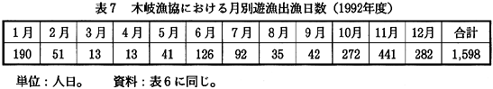 遊漁には「磯付け」と「船釣り」の方式があり、木岐では後者の方が多い。この場合、平均して1雙に4人の釣り客を乗せて、1日約3万円の収人となる。表7は、木岐漁協における月別遊漁出漁日数をみたもので、操業は10月〜1月期の冬季に集中している。木岐漁民の主たる漁業である定置網・一本釣り・海十漁とも、おもに4月〜9月までの夏場に行われ、10月〜1月の漁閑期がこれに当てられている。ただし、遊漁案内を行わない組合員は、この時期にはエビ刺網漁や三枚網、イサリ漁などに従事している。