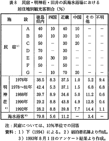 海水浴客へのアンケート調査結果 1993年8月1日に海水浴場で面接法による聞き取り調査を行い、89組から回答を得た。この日は薄日が射す曇空で、しかも14時頃から雨が降り出したため、必ずしも適切な調査日ではなかった。しかし、1993年は冷夏に加えて週末に台風の飛来することが多く、やむを得ずこの調査結果を利用することにした。 海水浴客の居住地は79.8%と圧倒的に県内が多く(表8下段)、とくに徳島市が31組と全体の35%に達した。うち、1組を除いて、すべて県東部の市町村からの海水浴客であった(由岐町内5組も含む)。県外からの海水浴客の場合も、徳島県内の出身であるか、あるいは県内の親類・友人を訪れた際に当海水浴場に来たものが多く、そうした海水浴客も県内関係者とみなすならば、県内からの来場者のポイントはさらに4.4%上昇する。海水浴客の社会的関係は「家族」が63%であり、「友人」が33%であった。 以上のように、田井の浜海水浴場の利用客は徳島市周辺からの家族・友人による日帰り客が多い。そうした中で、宿泊客も24組(27%)を占め、その多くが町内の宿泊施設を利用していた。利用頻度についても、「初めて」の来場者が24組あった反面、10年以上利用している海水浴客も54組(61%)にのぼった。このように、当海水浴場は比較的集客範囲が限定されたなじみ客によって、身近な海水浴場として利用されてきたといえる。 なお、シャワーなどの設備に関しては、数が不十分との意見もあったが、おおむね満足しているようである。しかし、調査対象となった海水浴客の大半が自家用車で当海水浴場を訪れており、駐車場の確保は重要な課題である。 3