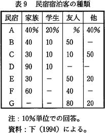 表9における宿泊客の種類で、「友人」とあるのはほとんどが釣り客である。この県外からの釣り客相手に特化した民宿が1軒(表8中のG)あり、逆に海水浴などを目的とする家族連れを宿泊客としているものも1軒(同D)存在するが、両者を同程度受け入れているものも多い。 2