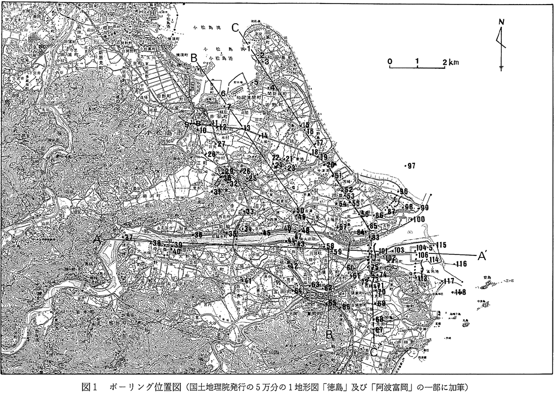 12,東京大学出版会,145p. 日下雅義,1962:那賀川下流域における平野地形の発達と開発の進展.平野の地形環境,古今書院,p.20-44. 町田 洋・新井房夫,1992:火山灰アトラス―日本列島とその周辺―.東京大学出版会,276p. 松島義章,1984:日本列島における後氷期の浅海性貝類群集.神奈川県立博物館研究報告(自然科学),no.15,p.37-109. 中尾賢一,1995:那賀川平野沖積層から産した軟体動物化石.徳島県立博物館研究報告,no.5.(投稿中). 中川衷三・須鎗和巳,1965:徳島北部海岸平野の地下地質.徳島大学学芸紀要(自然科学)vol.15,p.25-35. 小川 豊,1978:那賀川の旧河道について.建設省徳島事務所,111p. 式 正英,1964:徳島臨海地帯の微地形.都市地盤調査報告書,建設省計画局,vol.7,p.10-27. 鈴木好一・北崎梅香,1964:徳島臨海地帯の地盤.都市地盤調査報告書,建設省計画局・徳島県,vol.7,