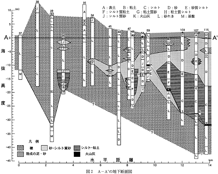 でよくそろっている。井関(1992)の沖積層上部砂層の一部にあたる。 5)上部礫層 色調は青灰〜暗灰色。海退期の河川性堆積物と海浜性の礫質堆積物。連続性はよくない。上流側では、厚くなると同時に中部泥層を挟在しないため、基底礫層と連続的で区別は困難となる。このうち、海浜性の礫質堆積物は、井関(1992)の沖積層上部砂層にあたる。海退期の河川性堆積物は、その成因から見て、頂部陸成層に相当する。 6)最上部泥層 青灰〜暗灰色の粘土・シルト・砂の薄層・互層から成る陸成層で、ところにより有機物を多く混入し、下流域でよく発達している。氾濫(はんらん)原・後背湿地などの非海成水堆積物と考えられる。井関(1992)の頂部陸成層にあたる。