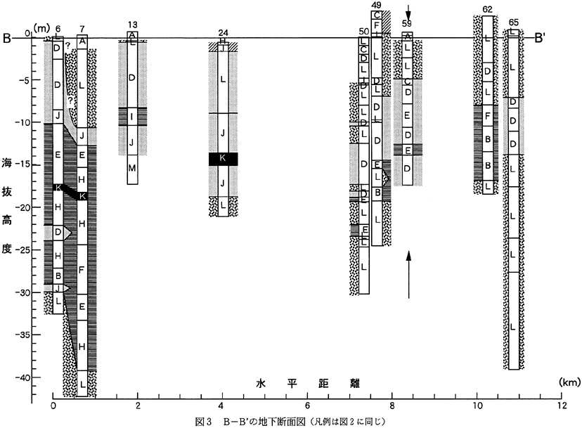 と薄く断続的である。井関(1992)の沖積層中部泥層に相当する。 4)上部砂層 青灰〜暗灰色の砂層。有機物・貝殻片の混入がみられる。東西断面図(A−A')の地点34より下流側では、比較的連続性はよい。図4に示す南北断面図(図1のC−C'