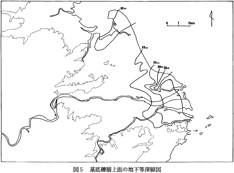 以下)と深井戸(20〜30m)とに大別される。沖積層の層序と地層区分を中心とした地質構造から判断すると浅井戸は不圧帯水層から、また深井戸は被圧帯水層から揚水していると考えられる。福尾ほか(1980)は、那賀川平野におけるアユ養殖とウナギ養殖による揚水量と地下水の塩水化との関連を考察している。河口付近では、ウナギ養殖の深井戸による揚水で、年をおって地下水の塩水化が拡大している。出島付近の1971〜1975年の深井戸の塩素イオン等濃度線図では、地下水の塩水化は、一様に内陸に向かって拡大しているのではない。拡大の仕方は、基底礫層上面の深度(図5)に調和的である。筆者らのボーリング資料にもとづく解析によれば、出島付近の地下水の塩水化の拡大と基底礫層上面の深度分布が調和的であること関しては、以下の可能性が考えられる。福尾ほか(1980)の被圧地下水は、筆者らの調査にもとづく層序と地層分布から判断すると、下部砂層〜基底礫層に含まれる。下部砂層と基底礫層の透水係数はほぼ同じか、礫層の方が高い状況にある。深井戸を掘る場合、基底礫層はN値が50以上と大きので、値の小さい下部砂層の方が基底礫層より掘削が容易である。埋積された谷地形であれば周囲から地下水が集まり易い。したがって、基底礫層上面が谷地形として、下部砂層の底面深度が深くなっている場所は、効率的に井戸を掘るのに適した場所といえる。しかし、一方で、出島付近は海岸に近く、しかも深層の高い被圧状況下で淡水が、汲み上げられることにより淡水より密度が大きい塩水が侵入し易くなる。このように、基底礫層上面の深度が深い谷地形の地点を中心に塩水化が拡大したと推測される。小松島市櫛渕町では、井戸堀で塩水が出てくることが知られている(寺戸、1990)が、これは前章で述べた縄文海進時の内湾形成が、それに先立つウルム氷期の旧河道による谷地形を母体として発達したことが影響していると考えられる。一種の埋積された溺れ谷とみなされる。