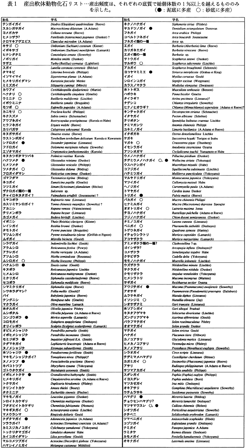 までの中部泥層の上半部、砂質部はそれより上位の砂層からもたらされたと判断される。 1)貝化石 砂質部と泥質部を合わせて163属193種の軟体動物化石が確認された(表1および図版1.2)。泥質部で多いのはハナムシロ