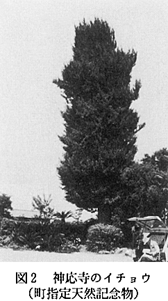 ほか)、アラカシ(0.98m)、クロガネモチ(2.41m)、ヒノキは0.50m前後が20余本、クスノキ。 17)原の原集会所 ホルトノキ(2.01m、2.32m)、イチョウ(2.20m)、イヌマキ。 18)神応寺 イチョウ(3.57m)(図2)、スダジイ(3.41m)、ホルトノキ(3.29m)、クロガネモチ(1.63m)、イチイ(0.92m)、ナギ(0.38m)、ヤブニッケイ(1.21m、0.89m、1.04m)。スダジイ、ホルトノキ、イチョウなどの巨樹から寺の歴史の重みが感じられる。