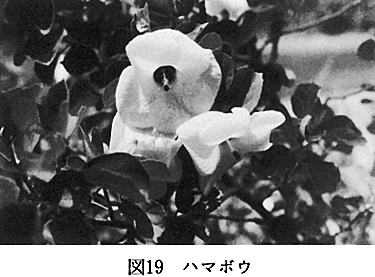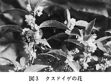 ほか16本)、ヒサカキ、クロマツ、イチョウ。イヌマキ、ホルトノキ、ヒノキが中心の社叢林である。 29)島尻の厳島神社 ヒノキ(0.63m、0.64m、1.26m)、エノキ(1.22m)、ヤブニッケイ(0.78m)、クロガネモチ(1.45m、0.90m、0.91m、1.49m、1.58m)、イヌマキ(1.25m、1.51m、1.56m、1.41m、1.37m)、モッコク(0.83m、0.90m、0.90m、0.92m)、ホルトノキ(1.83m、2.14m、1.72m)、ヒメユズリハ(0.96m、0.75m)、クスノキ(3.11m)、カクレミノ(0.63m)、クロマツ(1.11m)、タブノキ(1.01m)、ソメイヨシノ、ヤブツバキ、ゲッケイジュ。多く植栽されているのは、モッコク、ホルトノキ、イヌマキ、クロガネモチの常緑広葉樹で、暖地ではよく見られる庭園木である。すべての樹木に樹名札がつけられており、県下では珍しく、親しみが感じられる。 30)黒地の道浄寺 イチョウ(4.73m)、クロマツ(1.23m)、ケヤキ(0.60m)、ナギ(0.43m)、サルスベリ、ヤマモモ、ヒマラヤスギ、ホルトノキ、ケヤキ、タイサンボク、クロガネモチ、セイヨウシャクナゲ、オオムラサキ、カイヅカイブキ、イヌマキ、ヒムロ、アカマツ、ツバキ、ナシ、モクレン、イロハモミジ、クロマツ、イヌツゲ、ウメ、コブシ、アラカシ、コムラサキシキブ、カナメモチ、アオキ、ハギの1種、キンシバイ、チャノキ、チョウセンマキ。 31)出島の神明宮 高木層 クスノキ、ムクノキ(0.55m)、エノキ(1.95m)、ヤブニッケイ(0.93m)、アカメガシワ。 亜高木層 ヤマモモ、ヤブニッケイ(0.43m)、ハチク、ウバメガシ(0.48m)、ハゼノキ、ヒメユズリハ(0.53m)。 低木層 ヤブニッケイ、ハゼノキ、ネズミモチ、クスドイゲ、アケビ、トベラ、ムクノキ、ネズミモチ、ウバメガシ、モッコク、マサキ、ヒサカキ、アキグミ。 草本層 ネザサ、ヨモギ、イノコズチ、ヤブカラシ、ツタ、ヒメムカシヨモギ、ジャノヒゲ、トベラ、ノブドウ、カクレミノ、キヅタ、アケビ、ヤブラン、テイカカズラ、ネズミモチ。 32)王子神社 クロマツ(1.92m)、クスノキ(1.24リm)、イヌマキ(1.72m)、ムクノキ(1.58m、1.86m)、ケヤキ(0.34m)、エノキ(1.29m、1.24m、1.31m)、クスドイゲ(0.93m)、カイヅカイブキ8本。クスドイゲの花はなかなか見られないのに、この神社でみごとな花を見ることができた(図3)。クスドイゲのイゲは神母と書き、高知県ではイゲ神社というのがあり、神社の境内に植えられることが多い。