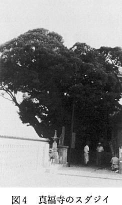 33)その他 徳林寺のイチョウ(3.09m)、飛龍神社のホルトノキ(2.99m)、真光寺のクロガネモチ(1.58m、1.71m)、小延真福寺のスダジイ(7.13m。県下一)(図4)、クロガネモチ(1.39m、1.22m)、島尻中田寿氏宅のホルトノキ(3.52m)、工地加藤実氏宅のマテバシイ(1.32m、1.04m)。
