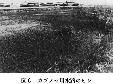 位で、水は停滞している。浮葉植物のヒシが一面に群生し(図6)、岸辺に有機質の多い泥質の水底を好むマコモ、キシュゥスズメノヒエがみられた。マコモは、用水路によく見られたが、改修と共に姿を消してゆく植物の一つである。肥大した茎は食川にしたり、薬用にも使われる。