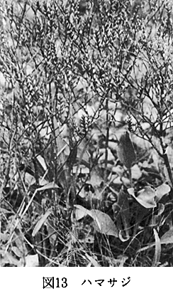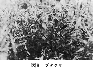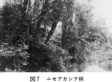 前後のニセアカシアが車道の両側に林立しているのを確認したが、1994年10月30日には、ゴルフ場側のニセアカシアは伐採されてゴルフ場の一部になっていた。ニセアカシアは荒れ地に肥料木として植栽されるが、落葉樹であるため、クロマツのような防風樹とはなりにくい。マメ科で、白い美しい花を咲かせるので、風致のために植栽されたのかもしれない。 ニセアカシア樹林(図7)にクロマツ、エノキ、カキ、ヤブニッケイ、マユミ、ハゼノキ、トベラ、ノイバラ、マサキがわずかながら侵入しており、その下部にヤマノイモ、カラスウリ、ヤブカラシ、ツルウメモドキ、アケビ、ヘクソカズラ、アオツヅラフジ、ノブドウなどのつる性植物が絡まりながら伸びている。その中にコセンダングサ、ヨモギ、ツルマメ、ヒメムカシヨモギ、マンリョウ、イノコズチ、ブタクサ(図8)、ヤブマオ、チジミザサ、ヤブジラミが混生しているに過ぎない。