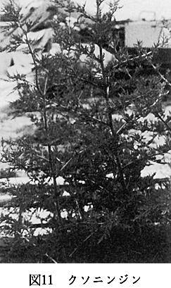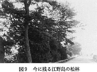 3)江野島の防風林 中島港から江野島にかけてのクロマツの防風林(図9)は、林層が浅いので、防風林としては弱い。その代わり民家の屋根より高い堤防を築き、防風、防潮の役に立てている。 昔の防風林の名残として、幹周1.44m