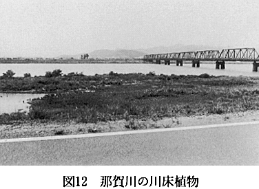 7.那賀川の川床、河川敷の植物 1)那賀川の川床 那賀川鉄橋下の那賀川の川幅の半分は、千潮に川床が現れ、こぶし大の石ころの川原になる。石ころの間に堆積物が積もって、川床植物を育てている(図12)。満潮時になると、一部だけ残して水面下に没してしまう。洪水時の濁流は、川床植物に多少影響を与えることはあっても、常は干満のゆるやかな流れの中で、造成や乾燥の心配もなく安定した環境にある。特にハマサジ(図13)、ハマゼリ、ウラギクを始め、オオニシキソウ、ツルヨシ、ヨシ、ヨモギ、メドハギ、トウオオバコ、ホウキギク、カワラヨモギ、オトコヨモギ、アレチマツヨイグサ、ヘクソカズラ、ハママツナ、ホソバアカザ、キバナカワラマツバ、ミチヤナギ、ハマヒルガオ、アイアシ、シオクグなどが水に没したり、現れたりを繰り返すので、生育する種類数も限られているように思う。洪水時以外水没しない個所では、メドハギ、カワラナデシコ、ガガイモ、ノイバラ、エノキなどや、秋には赤い実が枝一杯のアキグミが見られる。