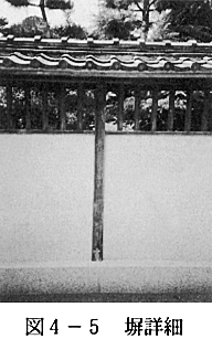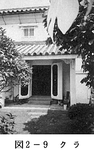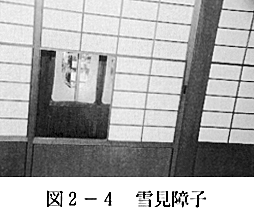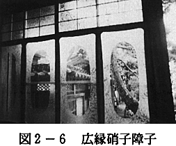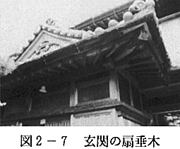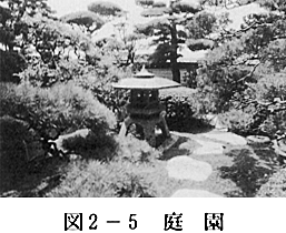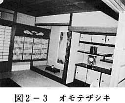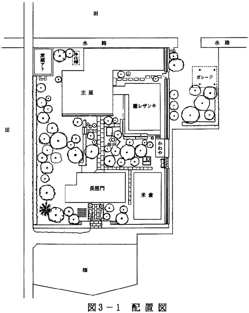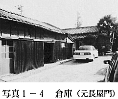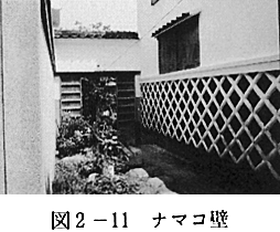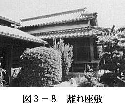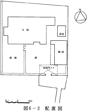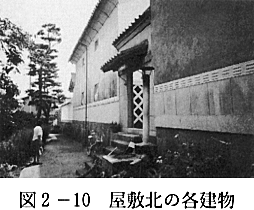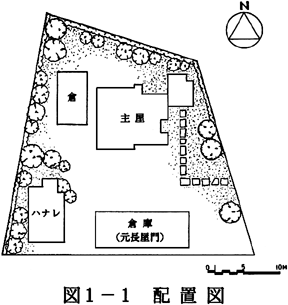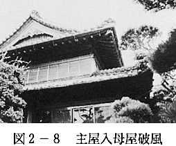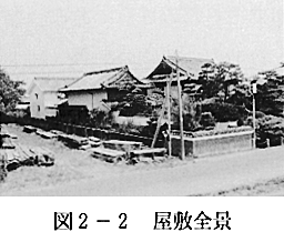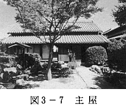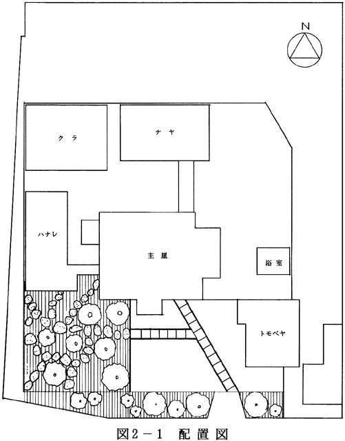 とし、使用木材はすべて栂(つが)の赤味材とした立派なもので、材木商ならではの贅沢(ぜいたく)なものである。 母屋は南面し、通路は門柱から来客用玄関、一般用玄関に接している。玄関から来客用座敷(向かって左)に入ると、書院造りの床の間、床脇を持った10帖の部屋である(図2−3)。部屋の南及び西には広縁をめぐらし、室内から庭園が眺められる雪見障子が入れられて(図2−4)、庭園の各種石灯籠(いしどうろう)や植え込みが眺められる立派な客間である(図2−5)。広縁は外部に真ん中を楕円に透明に抜いた時代を感じさせるデザインの型板硝子(がらす)の硝子障子が入れられ(図2−6)、離れ座敷や風呂(ふろ)、手洗所へと続いている。 玄関脇には「ミセ」の間があり、商取引の場所となっており、垂木は住宅では余り使わない扇垂木となっているし、隅木の木鼻は銅板包み、しかも家紋の剣先四ツ目が打ち出されている(図2−7)。また、二階入母屋部の破風には「鰭(ひれ)付き懸魚(げぎょ)」が、壁三角部には木蓮格子(もくれんごうし)、大屋根は照り屋根の堂々たる手法であり(図2−8)、部分的ではあるが、社寺建築の経験のある手慣れた大工棟梁(とうりょう)の意気が感じられる。 主屋の裏側に続いて、右側に「ナヤ」「ミソ」「ショウユ」「漬物」等の建物がある(図2−10)。左側には「クラ」があり、漆喰塗りの防火扉のついた入り口があり(写真2−9)、腰は「ナマコ壁」の漆喰塗りである。また、換気のための鉄格子付小窓を持っている(図2−11)。 表門に程近く右側には「トモベヤ」という建物があり、事務所兼待ち合わせ休憩の建物の様であるが、現在は二階を改造し居住をしている様である。(酒巻)