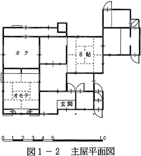 3.那賀川町の民家 (1)米澤重寛家(農家) 大字赤池267 那賀川の左岸、赤池地区の県道中島・古庄線に沿った材木置き場の北側に、米澤家は立地している。現在の家屋は、明治初期、現在の戸主である重實氏の祖父が、北海道の開拓から帰徳した際に建てたものである。帰徳後は土地を提供して、近隣の者との共同経営により、この地域の主たる産業の一つである製材業を営んでいたが、のちには土地を譲渡してしまったのだという。その後、祖父である初代主人は娘に養子を迎えたため、家にまつわる話などは充分に伝承されておらず、資料となるようなものも残っていない。重實氏はこの家に62年間住まっているが、家屋にまつわる詳細は不明であるとのことである。 敷地内の建物の配置(図1−1)については、木造平屋の寄棟造の主屋(図1−3)、その西には倉、西南にはハナレがあり、ハナレは隠居家として使われていたという。主屋の南には元の長屋門が残っており、現在は倉庫となっているが(図1−4)、昭和21年の南海地震の影響によって、一見して分かるほどに傾いている。この長屋門の方角から吹いてくる南風が、製材所からの木屑(きくず)をたくさん飛ばしてくるため、この家に住まう人たちを時に悩ませている。 主屋は最初、オモテ、オク(8帖(じょう))、チャノマ(6帖)、ウチ(8帖)に広いドマがあったようだが、このドマに座板を張るなどして、若干玄関まわりの様子を変えている(図1−2)。主屋の東側に、後年増築を施しており、およそ30年前に、茅葺(かやぶ)きの屋根に現在のように鉄板を巻いたということである。(吉原)
