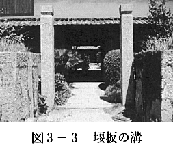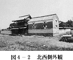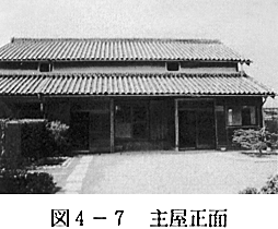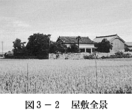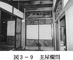 (3)橋本久家(五人組農家) 大字西原314番地の2 西原の県道から田んぼの中に見える大きな屋敷構えの橋本家は、石積みの塀に囲まれて数棟の建物が軒を並べている(図3−2)。 敷地は石積みの塀を西、南、東面の南部に巡らし北側は用水が流れ、川いっぱいまで石垣基礎の上に建物を建てているため城の堀のようである。塀を石垣にした理由は那賀川の氾濫(はんらん)に備えたもので、南側中央に開口を設け厨子(ずし)二階建ての長屋門を配している。この開口部には切り込みのある石を両側に設けて(図3−3)、洪水時にそこへ堰(せき)板を落とし込み、屋敷内への流入を防ぐようにしている。吉野川流域の藍(あい)師の大きな屋敷では石垣で敷地を高くした上に屋敷を構える事が多いのであるが、ここでは家に堤防を巡らしているかのようである(図3−4)。 配置は(図3−1)にみられるように敷地南面の長屋門をくぐり抜けた正面奥に文政12年(1829)建築の切妻日本瓦本葺きの主屋(図3−7)があり、主屋を中心に東に離れ座敷(図3−8)が建つ。北は主屋に接続して台所や風呂場を増築しているが、かつてここには味噌蔵が建っていた。西側に麦蔵があったが今は除却され基礎が残っている。また、長屋門の東には日本瓦本葺きの米蔵が建っている。 当主久氏によると橋本家は蜂須賀公入府時三河から荷駄役として随行してこの地に住んだが、かつては五人組組頭として最大時には田畑を和田島等に67町所有していたと伝えられているとのこと。屋敷は当初の場所から移転しており、墓は馬で引っ張ってこられる小さいものだそうである。正月に雑煮は食べず、握り飯と焼き味噌(みそ)を食するなど三河から移ってきた苦労を忍ばせる慣習を受け継いでいる。 主屋の屋根は明治5年に葦葺きから瓦に葺き替えられ、5年ほど前には瓦の葺き替えを伴う大改修と、北へ台所などの増築を行った。間取りは一般とは少し異なり、西に表座敷があり、七間取りに区切られている(図3−5)が、かつては変則の五間取りであった。 板戸の墨絵や欄間の彫刻は見事で普請時の財力とこだわりを感じさせる(図3−9)。東の離れ座敷は140〜50年前に日本画の画室として建てられたもので、本瓦葺き下屋付きの入母屋造で、10帖二間続きの座敷は共に床の間を設けている。これも贅を尽くし、後の何代かの当主が村会議員をしていたため来客も多く、会合に使われていたようである。西と南面に内縁を、西、南、東面に外縁を巡らしている。梁(はり)間三間、桁(けた)行六間の長屋門は(図3−10)切妻日本瓦本葺きの2階建てである。(林)