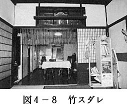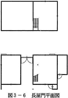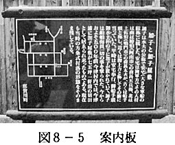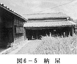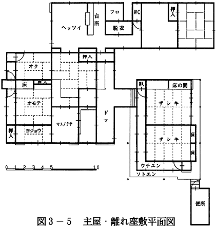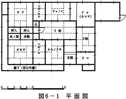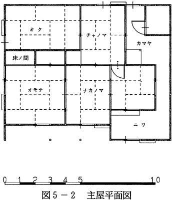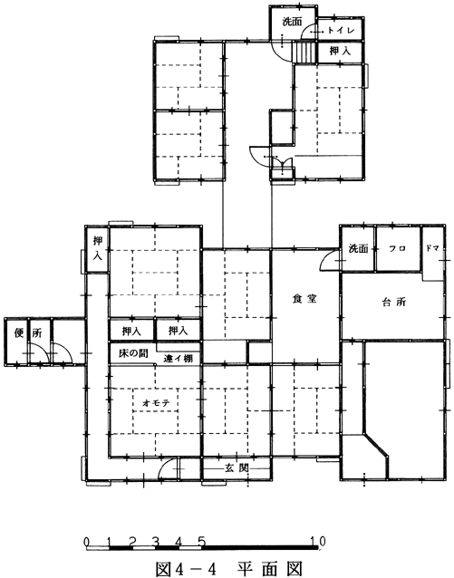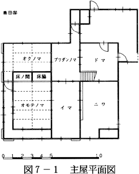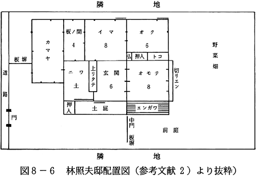 なお参考として、加子住宅の概要を列記しておく。 ◎ 南北に伸びる道路から短冊型敷地へ東・西側から入るが、住宅の出入口は南に決まっており、前面には前庭が設けられる。南北方向の道路の両側に、長方形の住宅が直行して整然と並んでいた。 ◎ 住宅は、船頭や加子の封建的な身分とはあまり関係がない。間取りは土間の「ニワ」と、「玄関」や「オモテ」、「オク」、「居間」、「板の間」の5つのユカからなり、さらに「カマヤ」を主屋に添えて建てる。四間取りの変形といえる。(図8−6)(田村) ※文中の番号