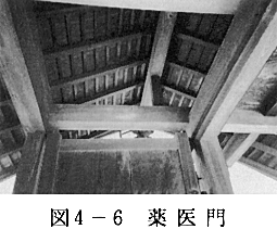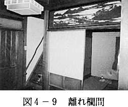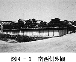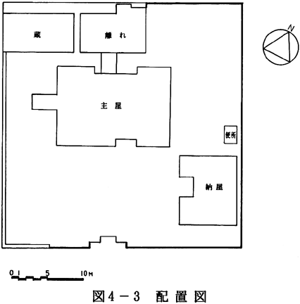 (4)松岡静夫家(組頭庄屋の家) 上福井元畭69出島 今回の調査で最も東側、那賀川の河口に程近い紀伊水道の波の音も聞こえてくる上福井の出島に松岡家はある。 敷地は四方に塀を巡らし(図4−1、4−2)、庭には松等の中高木を植えており、海からの風や台風への備えが見られる。塀は木造で塗壁、格子欄間に瓦葺きの本格的なもので(図4−5)、南側の薬医門(やくいもん)(図4−6、本柱が棟の芯(しん)よりやや表側に寄って立ち、背後に控え柱を備えた切妻造り平入りの門)と合いまって、どっしりとした中にも風情のある造りとなっている。 全体配置は門の正面に主屋があり、その北に離れ(インキョ家)、北西角には土蔵の蔵、そして南東側には、この地方の民家のほとんどがそうであるように納屋がある(図4−3)。 主屋は変形入母屋の2階建てで、西側が入母屋、東側が切妻になっている(図4−7)。天明?年の棟札により建築は215年程前のものと思われる。現在は東側土間を改修して台所として使っている。15年前に屋根瓦を葺き替えているが、主人がその時に出てきたスス竹でスダレを作っており、夏の風に涼やかな音を響かせている(図4−8)。このスス竹からも、建築時は茅葺き屋根だったものを後に瓦葺きに改造したものとも考えられる。 離れのインキョ家は入母屋造り2階建てである。主屋とは異なる造りで、家人によるとどこかから移築したものだそうである。透かし欄間や建具、自然木のままの階段手摺(すり)など、遊び心に富んだ造りが随所にみられる(図4−9)。主屋より家の建ちが高いのだが、年代は古いものと思われ、移築されたため主屋との高さのバランスが取れていない。主屋とは渡り廊下で巧みにつながれており、一体となって使われている。 蔵の南側には若宮さんが祀(まつ)られているが、以前は離れの東側の樫(かし)の木の南にあったそうである。 夏の庭に咲き誇る花木や、時おり吹き渡る風にカラカラと鳴る竹スダレの響きから、住む人のこの家に対する愛着と、この家に住み続けるのだというさわやかな意志のようなものを感じさせてくれる家である。(野口)