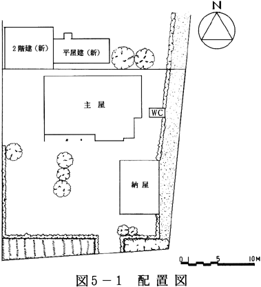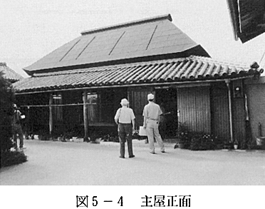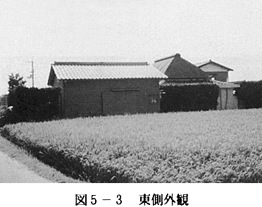 (5)大森政嘉家(農家) 大字芳崎160 大森邸は那賀川町のほぼ中央に位置し、敷地は水田に囲まれている(図5−3)。 アプローチ道路から主屋(右勝手)を正面にみた右側に納屋や倉庫を配置するという。南方(みなみがた)の平野農家の典型的な事例である(図5−1)。 主屋以外は新しい建物で、聞き取りによる主屋の建築年次は90年以前という。戦後にそっくり代がわりして入居したために古い資料は残されておらず、建築にまつわる伝承もない。寄棟造の主屋はもと草葺きの上屋で、現在は鉄板で覆われ、周囲は本瓦葺きの庇(ひさし)がめぐらされている(図5−4)。建設当初主屋は床上4室(オク、チャノマ、オモテ、ナカノマ)とニワ(土間)からなる4間取りであったと思われる。麦収穫後の作業が使われていたニワに部屋や物置が設けられ、また新建材を使った改造が多く行われて、建設当初の材は隠されている(図5−2)。大黒柱は225×190の杉。(田村)