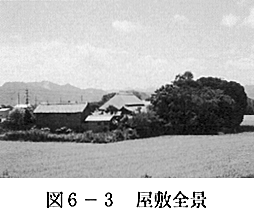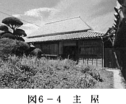 (6)島圭昭家(農家) 中島1669 那賀川の南岸、阿南市側の飛び地にこんもりとして美しい屋敷林と生け垣に囲まれて島家はある(図6−3)。建物の配置(図6−2)であるが、南の道路から細くて長いアプローチ道路が周囲の田畑より石垣で積み上げた敷地南東隅に取り付き折れ曲がって少し中央寄りより敷地に入ると、中央にトタンで巻かれた葦葺き四方下屋根の主屋がある(図6−4)。主屋東側に大蓋(おぶた)の付いた切妻日本瓦本葺き屋根の納屋を配しており(図6−5)、かつては南側入り口に長屋門が在ったそうである。 主屋は140年ほど前建てられたもので梁間五間半、桁行七間半で、現在は8間程の部屋に区切られているが(図6−1)、改造する昭和8年頃以前は土間が広く、現在の玄関、6帖間や9帖の一部は土間であった。次の間の前に玄関を持ち、六間取りを変形した七間取りで、南から西側に矩折(かねお)りに巡らした縁側は以前は外縁であったが、当時としても大規模な屋敷であった。かつて屋外にあった井戸も現在は増築したカマヤに取り込まれているし、土間入り口脇には小便所があったそうである。屋根の葦葺きは昭和41年頃鉄板を巻いたとのこと。納屋は明治期に建て直したものである。島家の先祖は鹿島氏の文書の中にも名前が出てくる原忠衛門で、この名を代々襲名していたそうである。しかし今は奥様一人が住まわれるのみとなっている。(林)