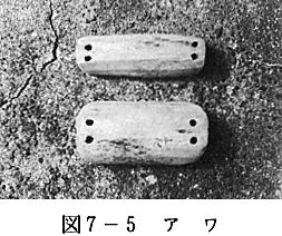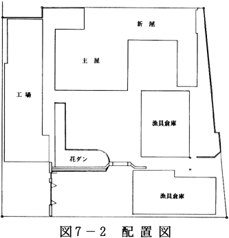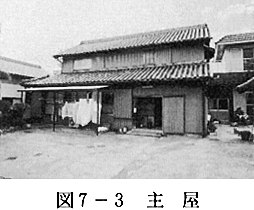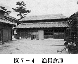 (7)島田彰一家(網元の家) 江野島825 町の北部にあり、海岸堤防沿いに民家が細長くつながる漁村集落のなかに立地する。道路と反対の敷地の奥が堤防に接し、その先は紀伊水道がひろがる。 江野島の漁師として一番古いといわれる当家は、網元であった。敷地内の建物は、昭和7〜8年に建設された(聞き取り)主屋と、RC造の新屋、ちりめん加工が行われる工場、二つの漁具倉庫で構成される。 主屋は大屋根と庇とも本瓦葺きの2階建で(図7−3)、間取りや骨格の構造は当初のままであるが、外壁ひとみや内部仕上げなど改造された部分も多い。舟子が山から材料を運び、舟大工も手伝って建てたといわれる。かつて漁師は漁から帰ると、大漁であれば、ホラ貝を吹いて人を寄せ宴会をしたらしい。そのために広い座敷が必要で、当家でもオモテノマは10帖である。規模の大きい四間取りの間取りである(図7−1)。 主屋の東隣の漁具倉庫は、大屋根が本瓦葺き、庇は桟(さん)瓦葺き、建ちの低い厨子2階で、主屋と同時期の建物と思われる(図7−4)。右勝手の主屋の右側に納屋を置く。南方の配置パターン(図7−2)。 建設年度は新しいが、配置、間取りとも伝統的様式を踏襲してしたものといえる。 また当家には、かつて使用された定置網のアワ(木製のウキ)やイワ(オモリ)、タコツボなどの漁具が多く残されている(図7−5)。(田村)