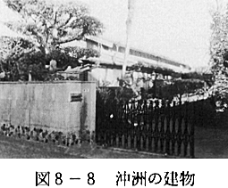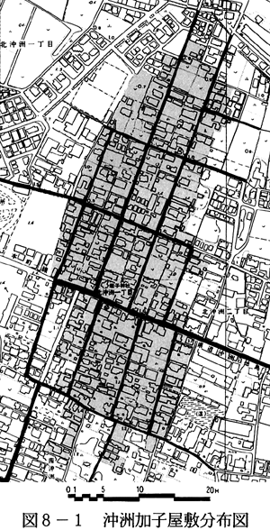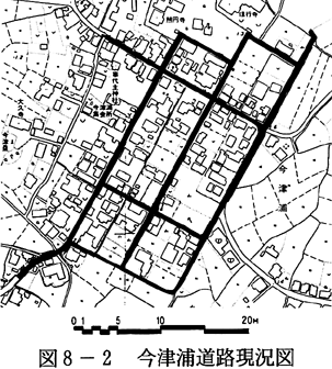 3)「加子御役所御構地之図天保(1830−43)ノ頃」より作成した沖洲加子屋敷分布図で、図8−2は今津浦道路現況図である。 道路構成や敷地配置に、沖洲と今津浦の類似点が認められる。街区の奥行が、沖洲50m、今津浦60m
